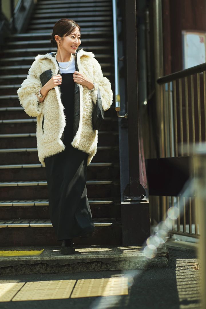 8.モノトーンコーデにボアコートを合わせて華やかに