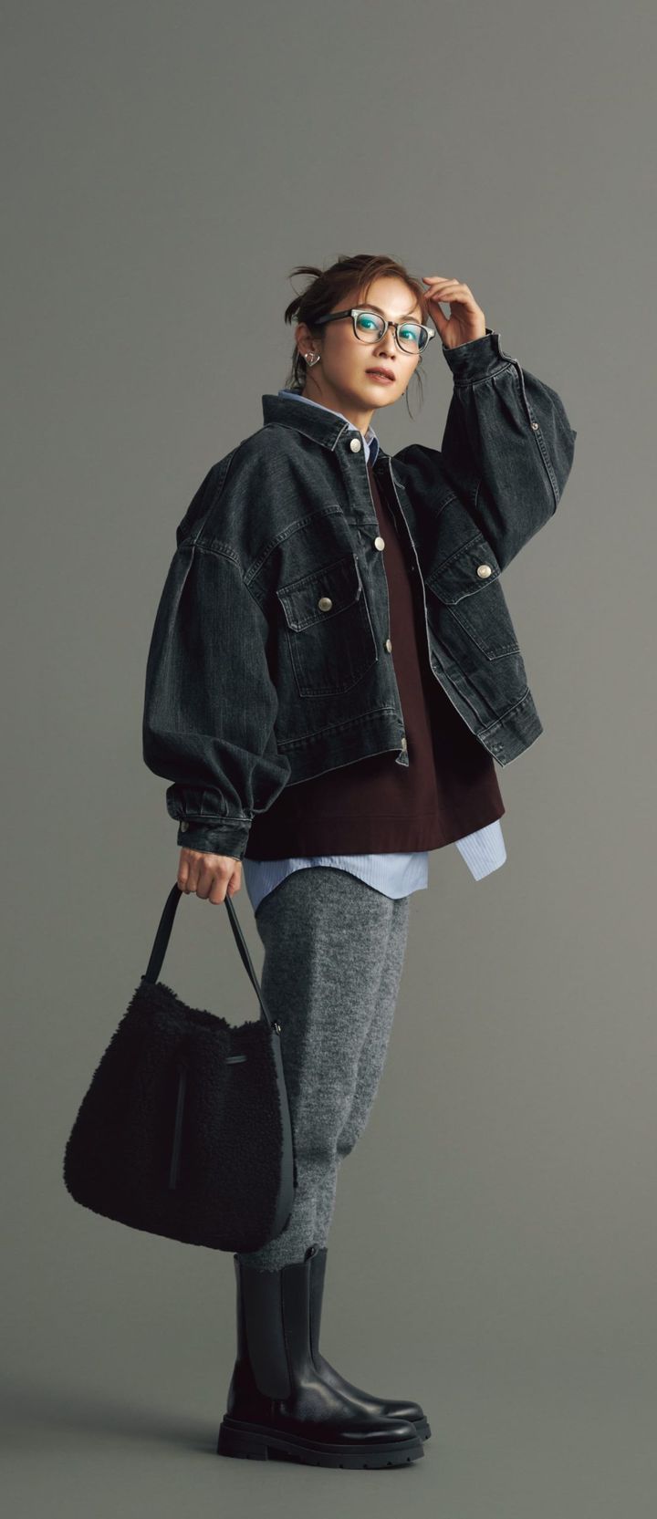 ショートブーツ[H5㎝]¥23,980(ドレステリア/ドレステリア 渋谷スクランブルスクエア店)ショートブーツ[H5㎝]¥23,980(ドレステリア/ドレステリア 渋谷スクランブルスクエア店)Gジャン¥53,900(ハイク/ボウルズ)スウェット¥42,900(エイトン/エイトン 青山)シャツ¥18,700(ミースロエ)パンツ¥15,400(エミ/エミ ニュウマン新宿店)バッグ¥50,600(ヴァジック/ヴァジックジャパン)イヤリング¥2,090(アネモネ/サンポークリエイト)眼鏡¥39,600(プロポ/プロポデザイン)