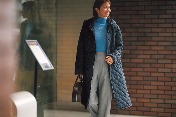 14.新鮮なブルーニットと上質なキルティングコートできちんと感アップ