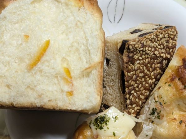 お惣菜2種は、卵が入ったふんわり生地で優しいお味。「オレンジパン」は、切った瞬間フワッと香るオレンジピールがたっぷり入っています。そして、店主イチオシの「ごまレーズンパン(カット)」は、ごまがびっしりでインパクト大!ごまの香ばしさとレーズンの甘みのコントラストが、止まらない美味しさでした。ほんのり甘い「メロンパン」も童心に帰って、子どもたちと楽しく食べましたよ。