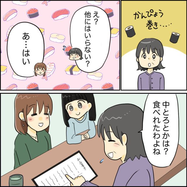 「かんぴょう巻き・・・」それだけ?と思った義母は「え?他にはいらない?」と聞き返しましたが「あ・・はい」ミホさんの返事を聞いて、「中とろとかは?食べられたわよね?」義母はさらにたずねました。