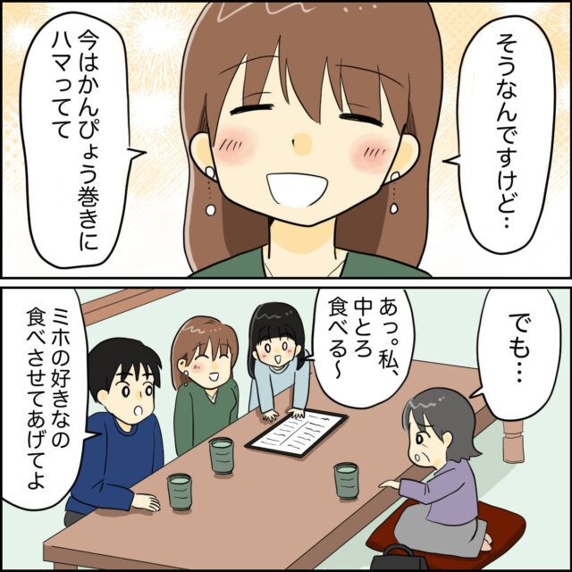 すると、「そうなんですけど・・今はかんぴょう巻きにハマってて」と笑顔で言うミホさん。「でも・・」と義母が言いかけると「あっ、私中とろ食べる~」と娘のコハルちゃん、ご主人タケルさんは「ミホの好きなもの食べさせてあげてよ」と義母に言うのでした。