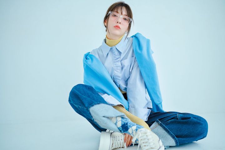 八木アリサ。ar10月号より イエロータートル¥29,700/ハクジ(ショールームリンクス) ブルースウェット¥16,500/アラミンタ ジ ェームス(ジャック・オブ・オール・トレーズ プレスルーム) ブルーシャツ¥35,200/バウム ウンドヘルガーテン(エスアンドティ) ブルーデニム¥31,900/バウムウンド ヘルガーテン(エスアンドティ) メガネ¥29,590/ジェントルモンスター(エム) ソックス¥9,900/バウム ウンド ヘルガーテン(エスアンドティ) スニーカー¥11,550/コンバース(コンバースインフォメーションセンター)