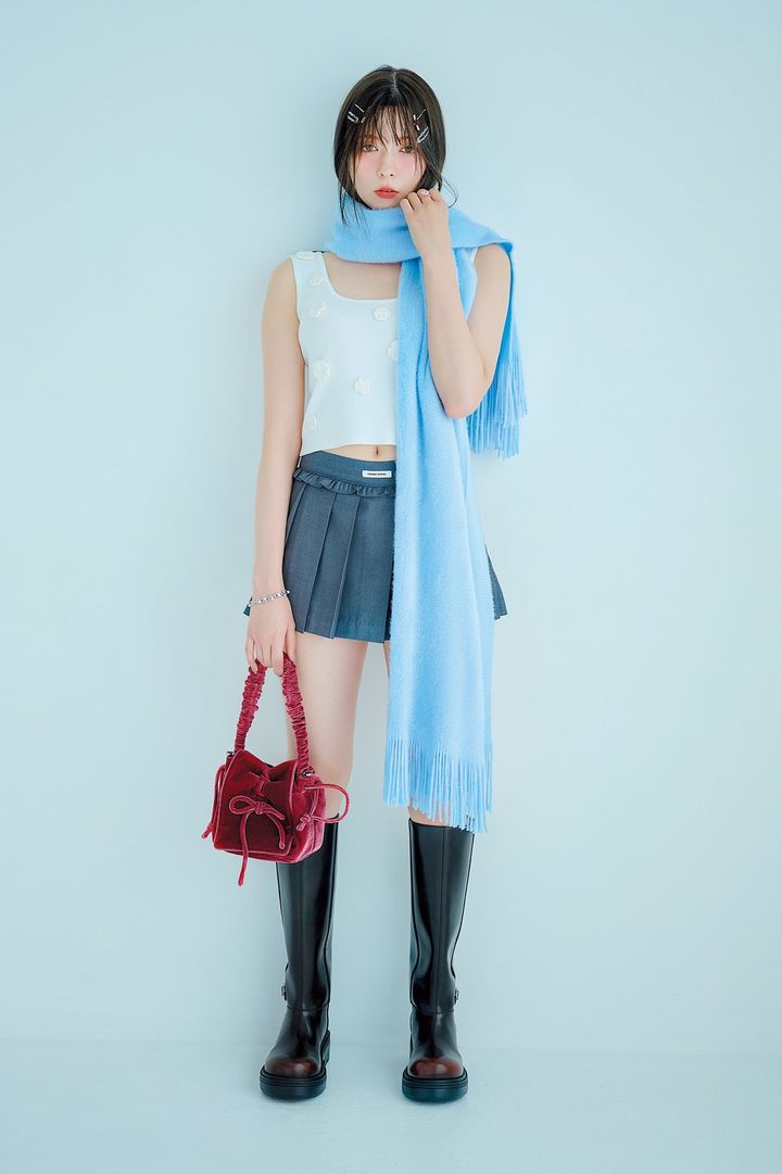 ニットタンクトップ¥8,360/ココ ディール プリーツミニ¥9,900/ガールズソサエティ ヘアピン(4本セット)¥1,650/3.3フィールド トリップ (エーランド/アダストリア) マフラー¥6,050/レイ ビ ームス(レイ ビームス 新宿) リング¥3,300/リキュエ ム ブレスレット¥28,600/ミクシマイ(ショールームシャルメール) バッグ¥10,900、ブーツ¥18,900/チャールズ&キース(チャールズ&キース ジャパン)