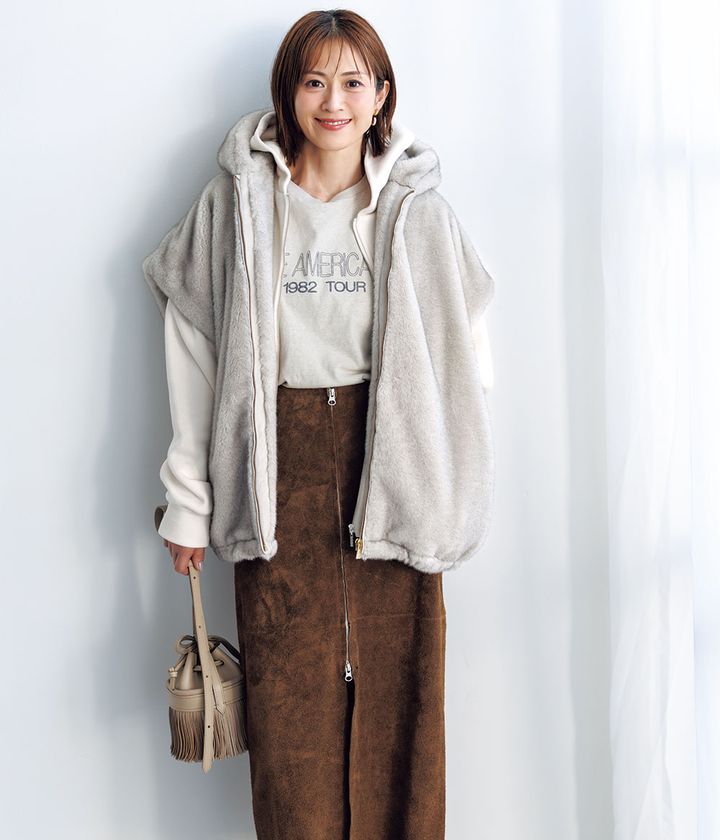 ベスト¥37,400(カレンソロジー/カレンソロジー 二子玉川)パーカ¥31,900(スリードッツ/スリードッツ表参道店)中に着たTシャツ¥8,580〈アメリカーナ〉スカート¥143,000〈ガブリエラ コール ガーメンツ〉(ともにサロン アダム エ ロペ)バッグ¥126,500(J&M デヴィッドソン/J&M デヴィッドソン カスタマーセンター)