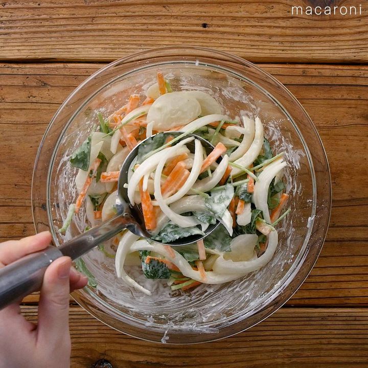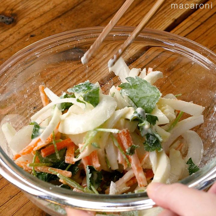 6: ⑤を④に加え、全体が絡むようさっくりと混ぜ合わせます。