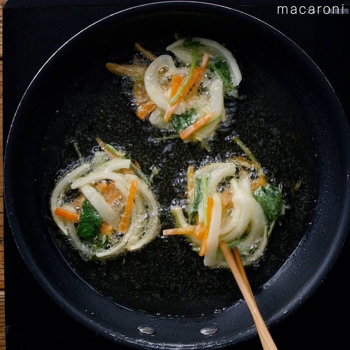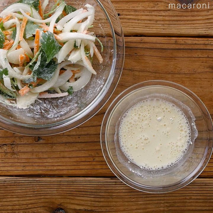 ※具がまとまるか心配な場合は、小さなかき揚げを作って試しに揚げてみましょう。パラパラと具が分離してしまう場合は、衣【A】を少しずつ加えて調整してくださいね。