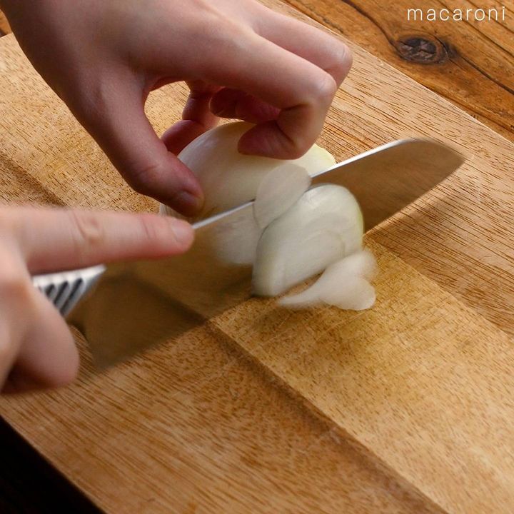 1: 玉ねぎは繊維に沿って5mm幅に切ります。
