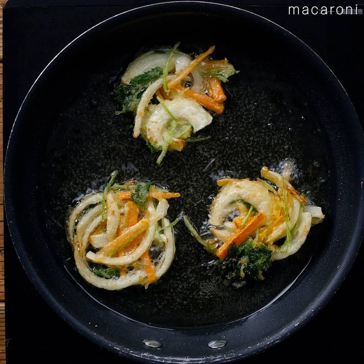 9: 30秒ほど触らずに揚げ、少し固まったら野菜同士の間に菜箸で穴をあけるように、手早く空洞を作ります。