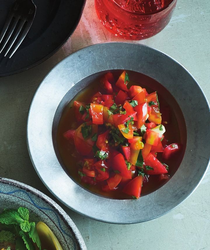 ❶ トマトはへたを除き、1cm角に切る。バジルは粗みじん切りにする。
