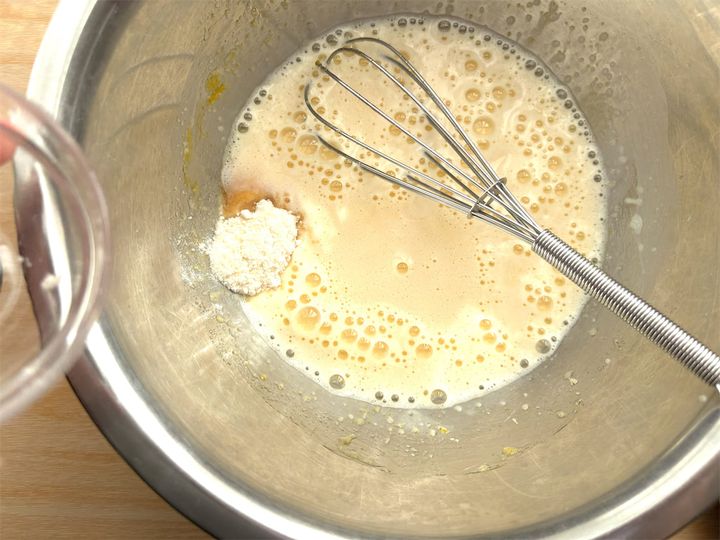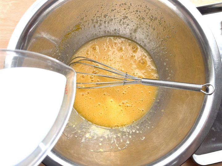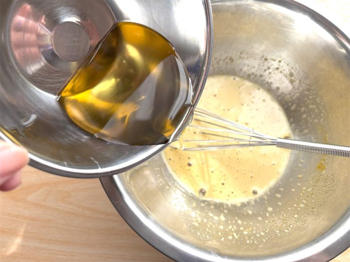 卵と砂糖がよく混ざって白っぽくなったら、植物油を加えてさらに混ぜましょう。