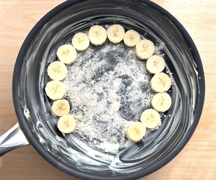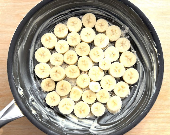 下の画像のように、フライパンの底全体にバナナを並べておきましょう。