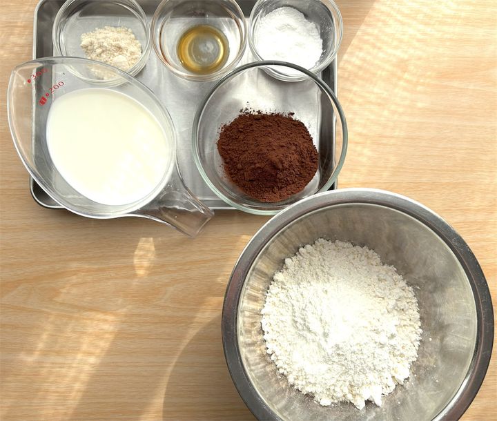 さらに、ココアパウダー、小麦粉、ベーキングパウダーをザルに入れてふるいながらボウルへ加え、