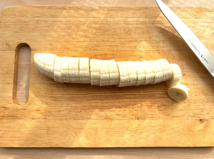 バナナは皮を剥いて、約1cm幅の輪切りにします。