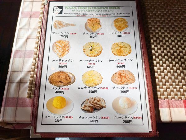 セットのナンはプレーン味になりますが、他にもチーズやゴマ・ココナッツナンなど種類が豊富です。 その他、チャパティやサフランライスなどもありました。