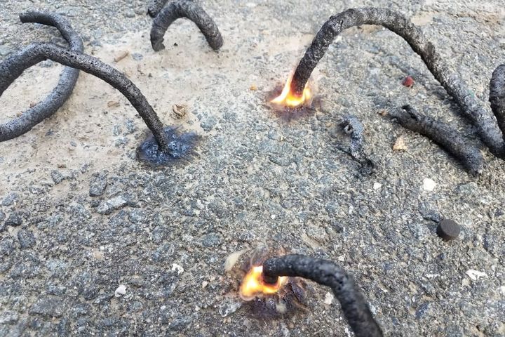 カルメ焼きでは、砂糖を熱して溶かした後、重曹を入れて素早くかき混ぜることで膨らんで固まりますが、ヘビ花火でも同じように膨らんでスポンジのように固まります。