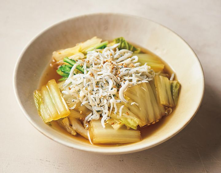 白菜のくたっと感がおいしい煮浸し。しらすとゆずこしょうで単調になりがちな煮浸しに、爽やかな風味のアクセントを追加。