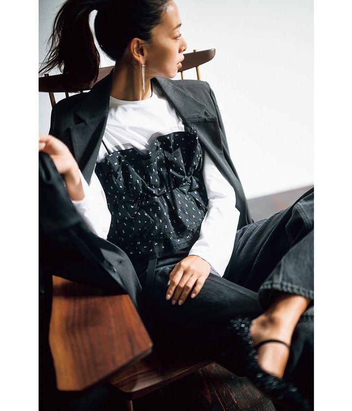 ビスチェ¥22,000(プランクプロジェクト/プランクプロジェクト 青山店)ジャケット¥37,400(カデュネ) Tシャツ¥16,500(エイトン/エイトン青山)パンツ¥9,900(Mila Owen/Mila Owen ルミネ新宿2店)バッグ¥34,650(テンドレッセ スタジオ/ウィム ガゼット 青山店)パンプス¥41,800(ピッピシック/ユナイテッドアローズ 六本木ヒルズ店)ピアス¥15,400(ブランイリス/ブランイリス トーキョー)ベルト¥12,100(レフィエ/フラッパーズ)