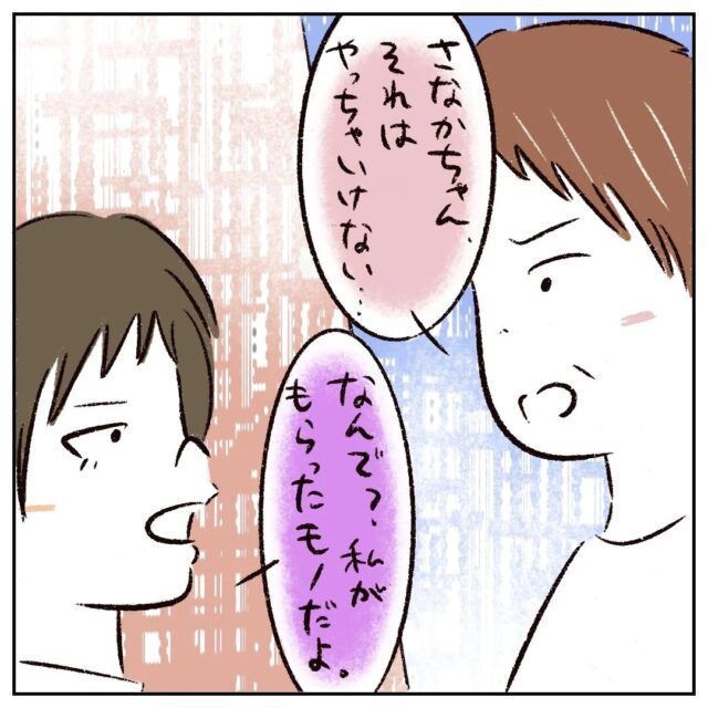 「さなかちゃん、それはやっちゃいけない。」まるさんのお母さんはさなかちゃんに伝えましたがさなかちゃんは「なんで?私がもらったモノだよ?」とさなかちゃんは引きません。