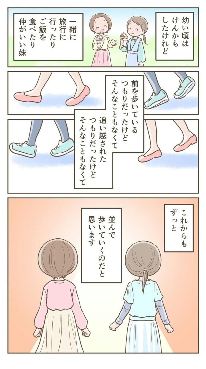 妹に追い越されたようでつらい思いもした妻でしたが、妹とはこれまでもこれからも並んで歩いて行くのだと気づいたそう。兄弟姉妹の関係も人それぞれですが、大人になったからこそわかる、すてきな姉妹の関係性でしたね。