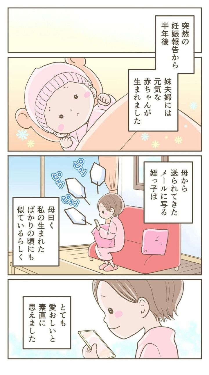 妹の妊娠報告を心から喜べなかった妻ですが、半年後、無事に生まれた赤ちゃんを見て素直に愛おしいと思えるように。孫を抱くうれしそうな両親の姿を見て、悔しい気持ちはありつつも、孫を授けてくれたことに感謝し、そして生まれて初めて妹を尊敬したそうです。