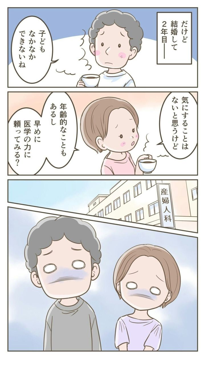 主人公の夫妻は、自己肯定感高めでポジティブな夫と、マイペースな妻で仲良く暮らしていました。結婚2年目のある日、なかなか子どもができないことから病院を受診してみることに。