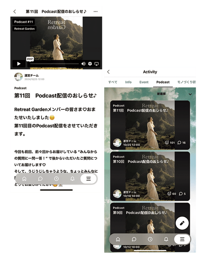 リトリートガーデン内でわたしのポッドキャストをやっています。基本的に、そのとき考えてることだったりもらった質問についてをひとりでしゃべってる。たまに子どもたちとお話ししたりもしてるよ♡