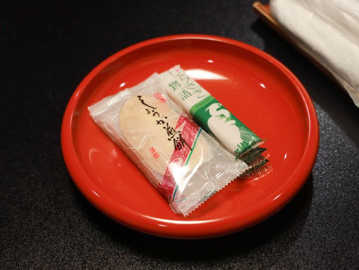 お茶菓子として「しょうが煎餅」と「しらさぎ物語」が用意されていて、ナイスなセレクト。渋めの見た目に反して洋風な味わいがたまらない、あずさ屋のしらさぎ物語はとても久しぶりに食べましたが、変わらず美味しかったです。