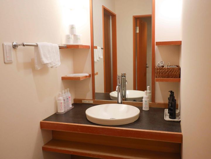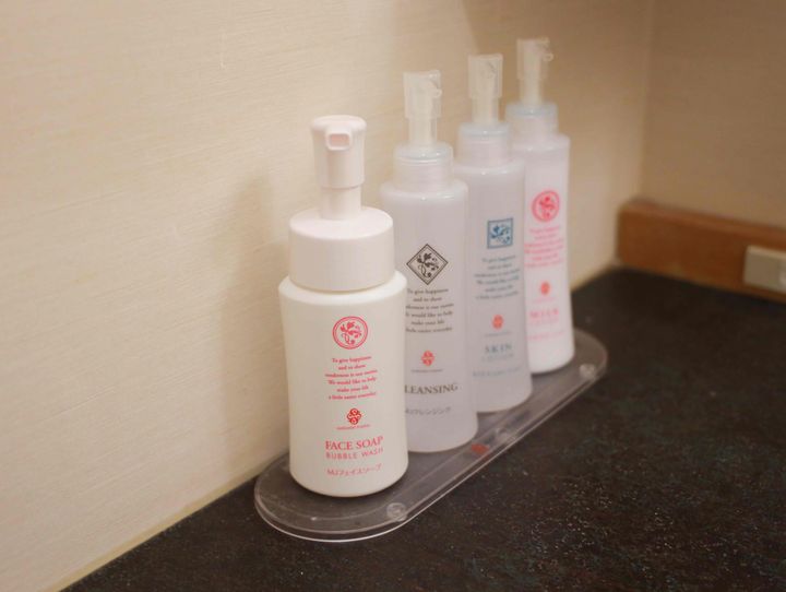 洗面台と湯船付きのお風呂、お手洗いは清潔感があります。アメニティとしてクレンジングや化粧水、クシやヘアゴム、コットンなど必要なものは十分に揃っていて助かりました