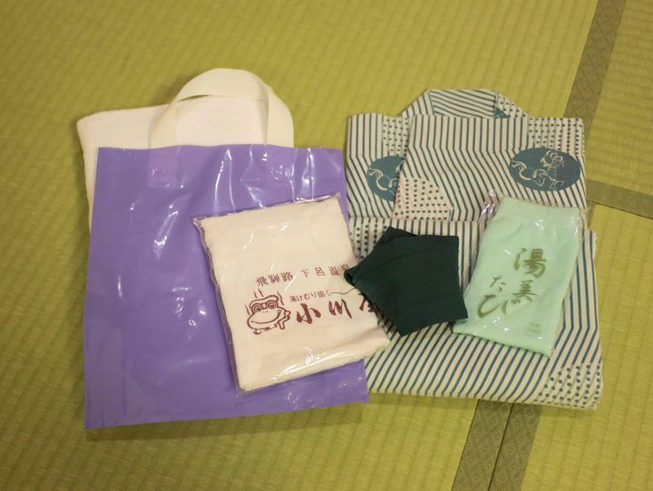 押入れの中には、施設内の大浴場を利用する際に持ち物を入れるための袋や浴衣、オリジナルのタオルなども。