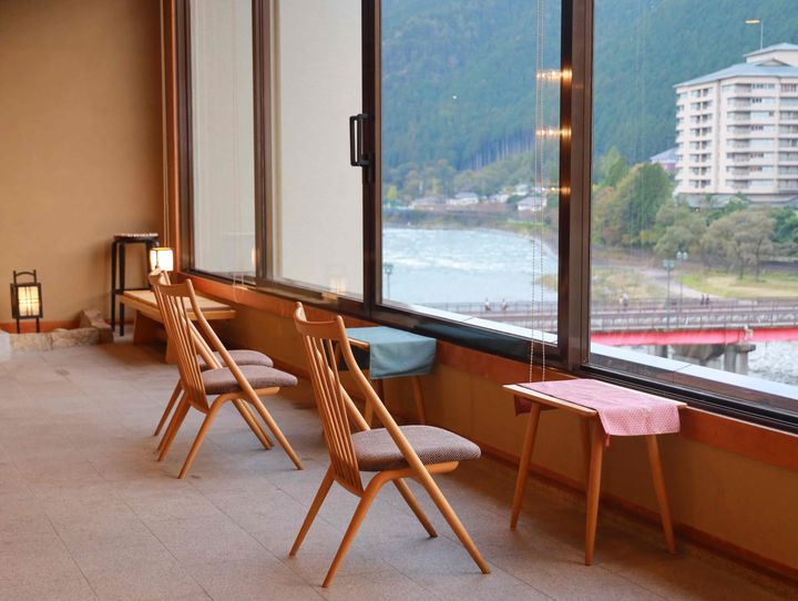 飛騨川を望む開放的な空間で家族に待ってもらいながら、同じフロアにあるカウンターでチェックインを済ませました。