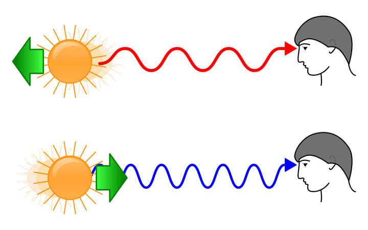 光のドップラー効果(光源が遠のくと「赤方偏移」が起こり、光源が近づくと「青方偏移」が起こる)/ Credit: commons.wikimedia