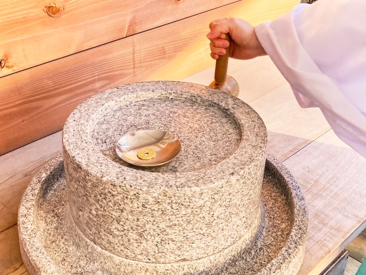まずは種銭を一つ受け取り、石臼の器にのせて右回りに3回転。