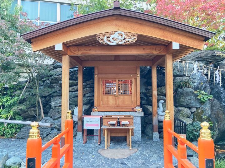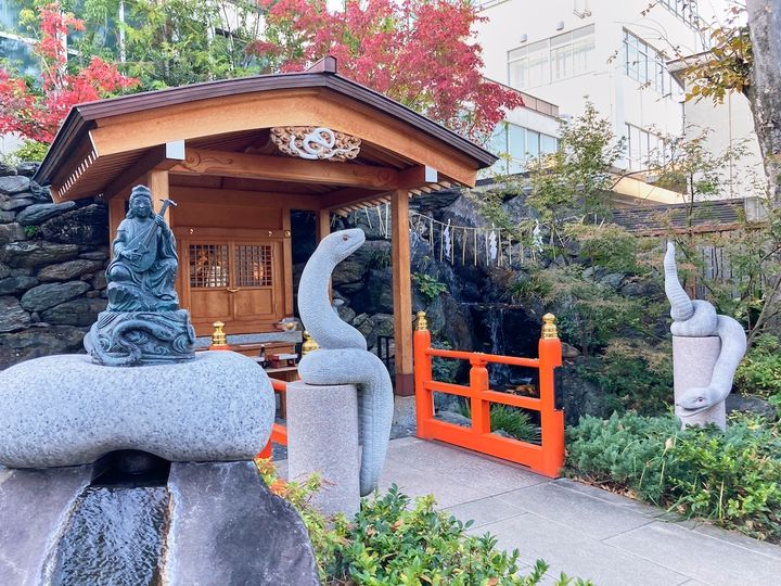 こちらは「白蛇辨財天社」。蛇は弁財天の使いでもあるとされています。かつて白蛇様を再びお迎えするために、池を掘って石祠を建てた伝承に由来しています。手前の「夢巳橋」も、夢枕にたった2匹の白蛇にちなんで名付けられました。