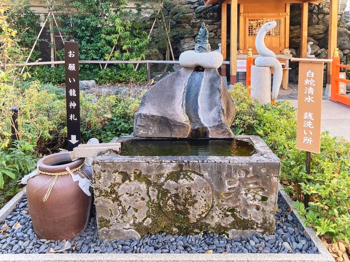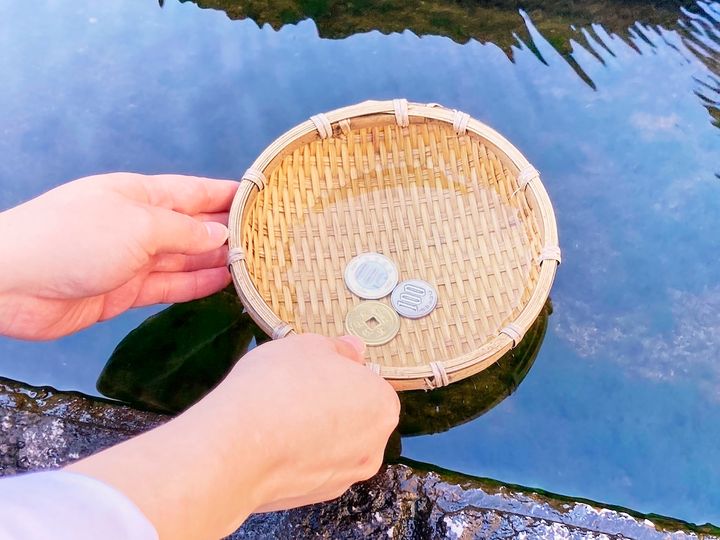 次に種銭と自分のお金をザルに乗せ、弁天様と白蛇が見守る白蛇清水に浮かべます。なかにはお札やクレジットカードなどを入れる方もいるのだとか。ここでも右へ3回回し、お金を清めてもらいます。