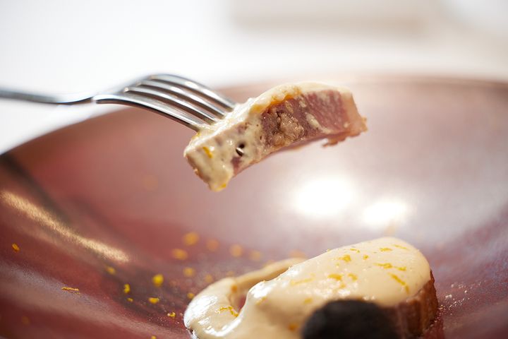 前菜の「真鴨 黒トリュフ」が運ばれてきました。秋らしいムードのお皿が美しく、白い空間に映えます。ヨーロッパ産の真鴨のむね肉ともも肉を一つの筒状になるように巻き込んで焼き、そこに鴨のフォアグラの温かいムースをかけたひと品。ふりかけられたオレンジの粉が目にも美しく、オレンジのフレッシュな香りがほのかに香ります。