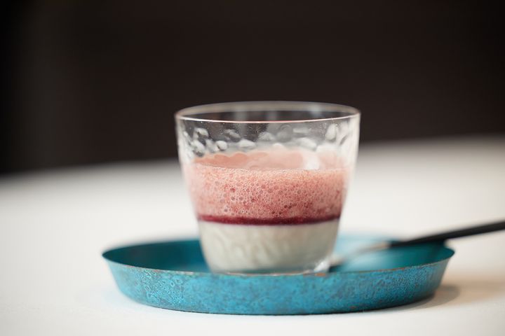そして、お皿の上に置かれます。バラのドライフラワーから抽出したバラエキスを、ムース状に。バラの香料や着色料を一切加えていないというこだわりのデザートです。