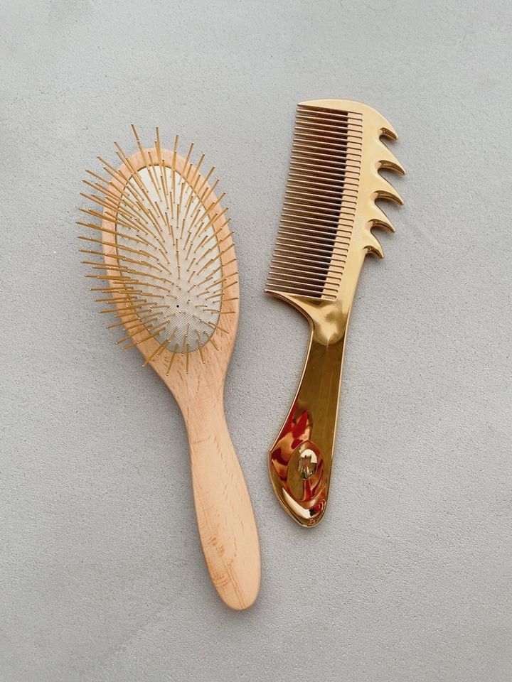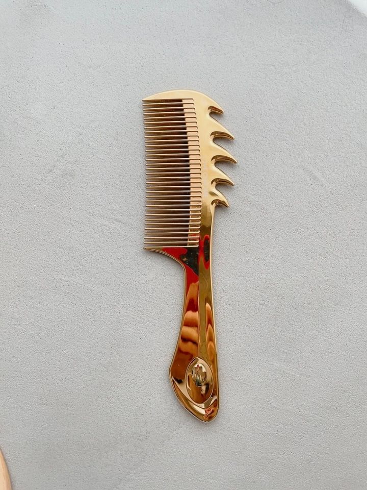 表面は純金加工。髪をとかすだけでなく、凝り固まった頭皮や顔の表情筋を心地よく刺激。