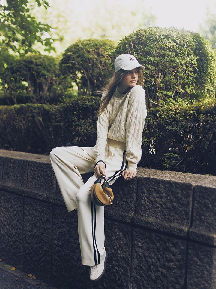 白ニット/THE SHINZONE(Shinzone ルミネ新宿店) 白サイドラインパンツ/フォルテ フォルテ(コロネット) キャップ/PHEENY ゴールドピアス/リューク ゴールドリング/ベベット キャメルバッグ/ポロ ラルフ ローレン(ラルフローレン) スニーカー/adidas(アディダスお客様窓口)