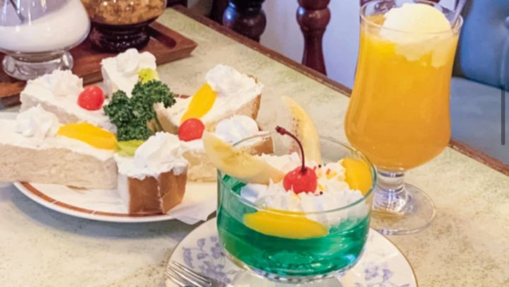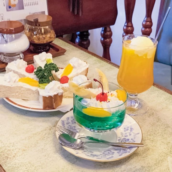多くの人に愛されてきた看板メニューのフルーツサンドとフルーツゼリー。なんとフルーツサンドはワンプレート430円!令和には絶対にない色使いや盛りつけが可愛すぎて刺激的♡