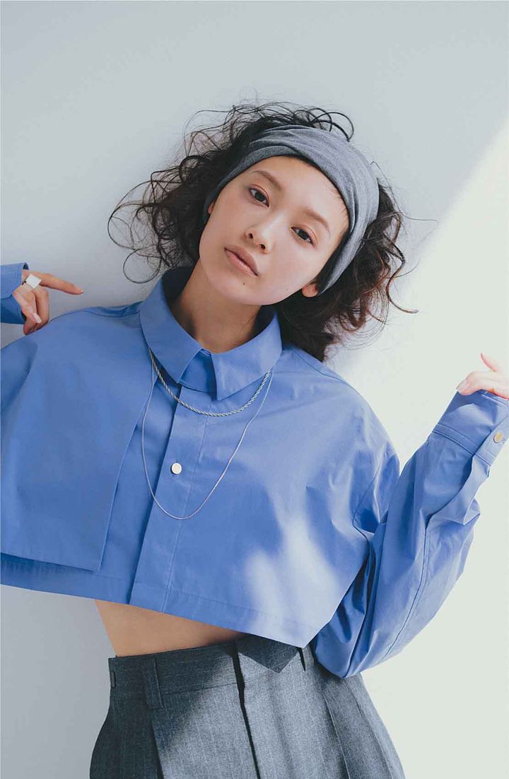 ターバン ¥6,600/CA4LA(CA4LA プレスルーム)、シャツ ¥28,600/CULLNI(CULLNIFLAGSHIP STORE)、パンツ ¥46,200/ANARCHIST TAILOR(Sian PR)、チェーンネックレス(短い方)¥8,470/Oyire_(JOYEUX)、チェーンネックレス(ロング)¥1,870/アネモネ(サンポークリエイト)、リング ¥4,950/ミミサンジュウサン(サンポークリエイト)