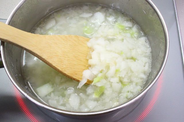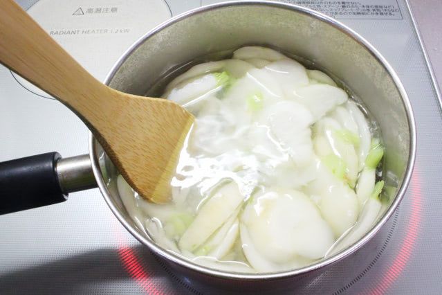 今回の「かぶのポタージュ」は、ミキサーでなめらかに仕上げるのではなく、木べらでかぶを崩しながら煮るのがポイントです。