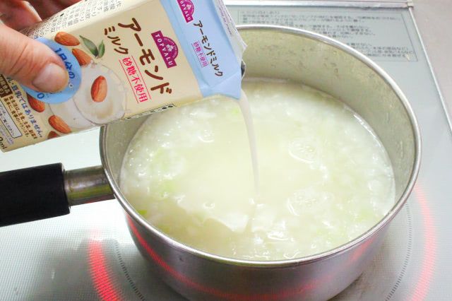アーモンドミルクを加えて仕上げます。注ぐと、アーモンドの香ばしい香りがほんのりと広がりました♪味見して、今回は、塩をひとつまみほど加えました。