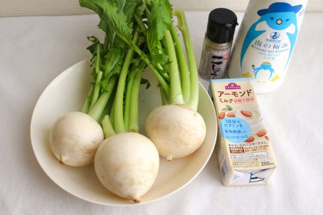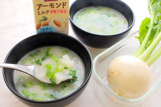 アーモンドミルク自体にクセがなく、ほんのりと甘いので、淡白な味わいとやさしい甘さを持つかぶと好相性。おいしいスープになりますよ。