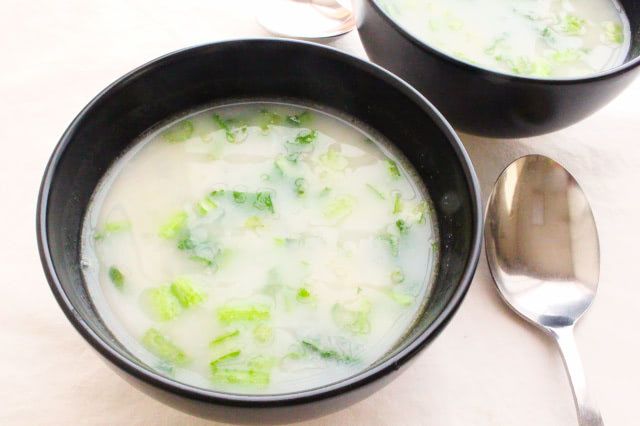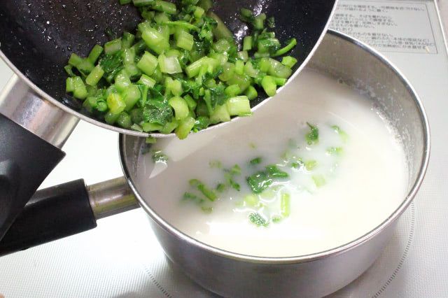 最後に炒めた茎と葉を加え、サッと混ぜます。真っ白のスープに、鮮やかな緑色の茎と葉が、とっても映える〜♪器に盛り付けたら、完成です。