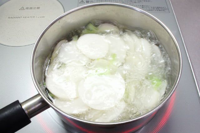 2. 鍋にかぶの白い部分とひたひたの水、塩を入れて、中火で加熱します。