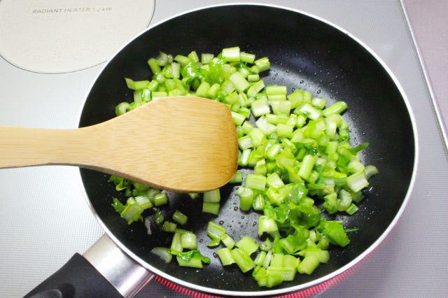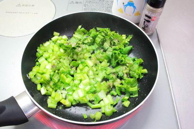 3. フライパンにオリーブオイルを引いて中火で熱し、茎の色が鮮やかになる程度に炒めます。そこへ葉、塩、こしょうを加え、サッと炒めます。