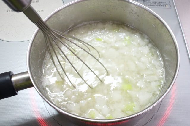 4. 2のかぶが煮えてきたら、木べらなどで叩いて粗く崩します。味見して塩・こしょうを加え、かぶが小さく崩れてきたら、泡立て器に持ち替え、さらに細かく崩します。