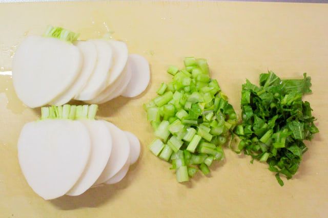 1. きれいに洗ったかぶを、白い部分と茎で切り分けます。白い部分は、皮付きのまま薄切りに。茎は小口切り、葉は細切りにします。