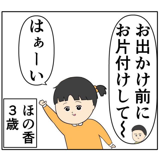 3歳になったほの香ちゃんに、良し男さんも声をかけます。「お出かけ前にお片付けして~。」すると「はぁーい」と元気よくお返事するほの香ちゃん。